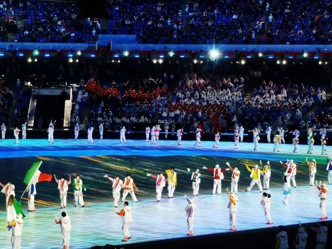 伴随着昂扬欢快的音乐,英姿飒爽的各国运动员在标兵志愿者的欢迎下步入“鸟巢”主场地,完成2022年北京冬季奥运会的首次正式亮相。跟随音乐摆动手臂,舞动身体,脚下的步伐欢腾雀跃,标兵志愿者的热情与活力感染着现场的每位运动员与观众,脸上洋溢着口罩也遮不住的笑意,他们向全国、全世界展示着中国青年活泼、欢快、朝气蓬勃的精神面貌。
